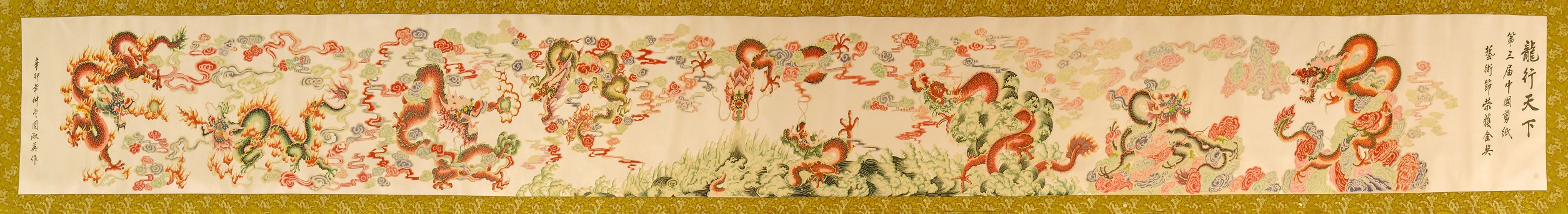 这幅作品长9.9米,高0.99米,画心中有9条龙,一共5个数字“9”,寓意是“九五至尊”。