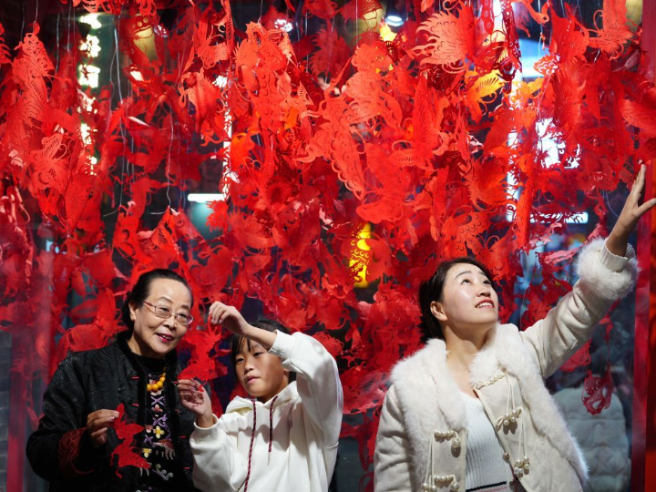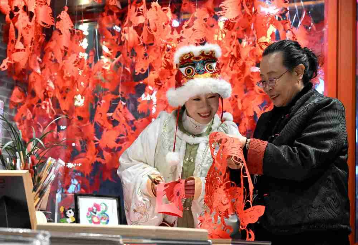 河北省石家庄市着力培育夜经济新场景新业态,打造集美食、娱乐、购物、非遗等于一体的夜经济消费圈,丰富市民夜生活。国家级非物质文化遗产项目“蔚县剪纸”代表性传承人、《中华技艺书系·剪纸》第二作者周淑英在图片中现身。
